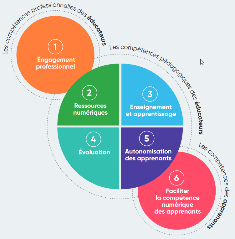 En plus du référentiel DigComp à l’attention des citoyens, un cadre de référence des compétences numériques spécifique à l’attention des enseignants est également disponible : le DigComp Edu. Celui-ci identifie 22 compétences déclinées en 6 domaines :